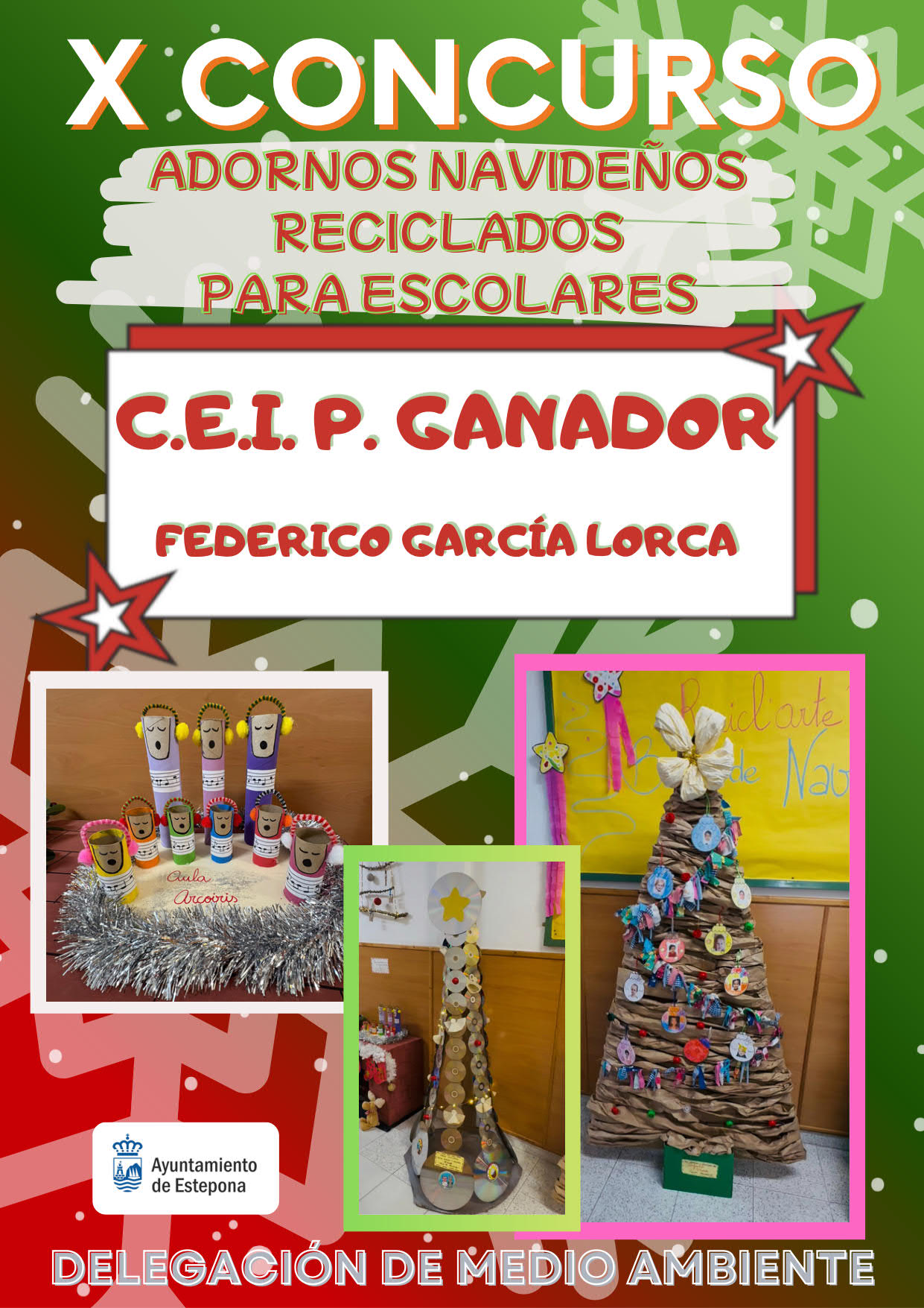 El CEIP Federico García Lorca de Estepona ha sido el ganador del Concurso de Adornos Navideños Reciclados que organiza el Ayuntamiento de Estepona y que premia la creatividad, el esfuerzo y el trabajo en equipo de los escolares. Este año se celebra la décima edición de esta modalidad donde los materiales reutilizados se transforman en elementos de un decorado navideño recreando la magia de la Navidad, al mismo tiempo que se promueve la conciencia medioambiental entre los alumnos de primaria de Estepona.
